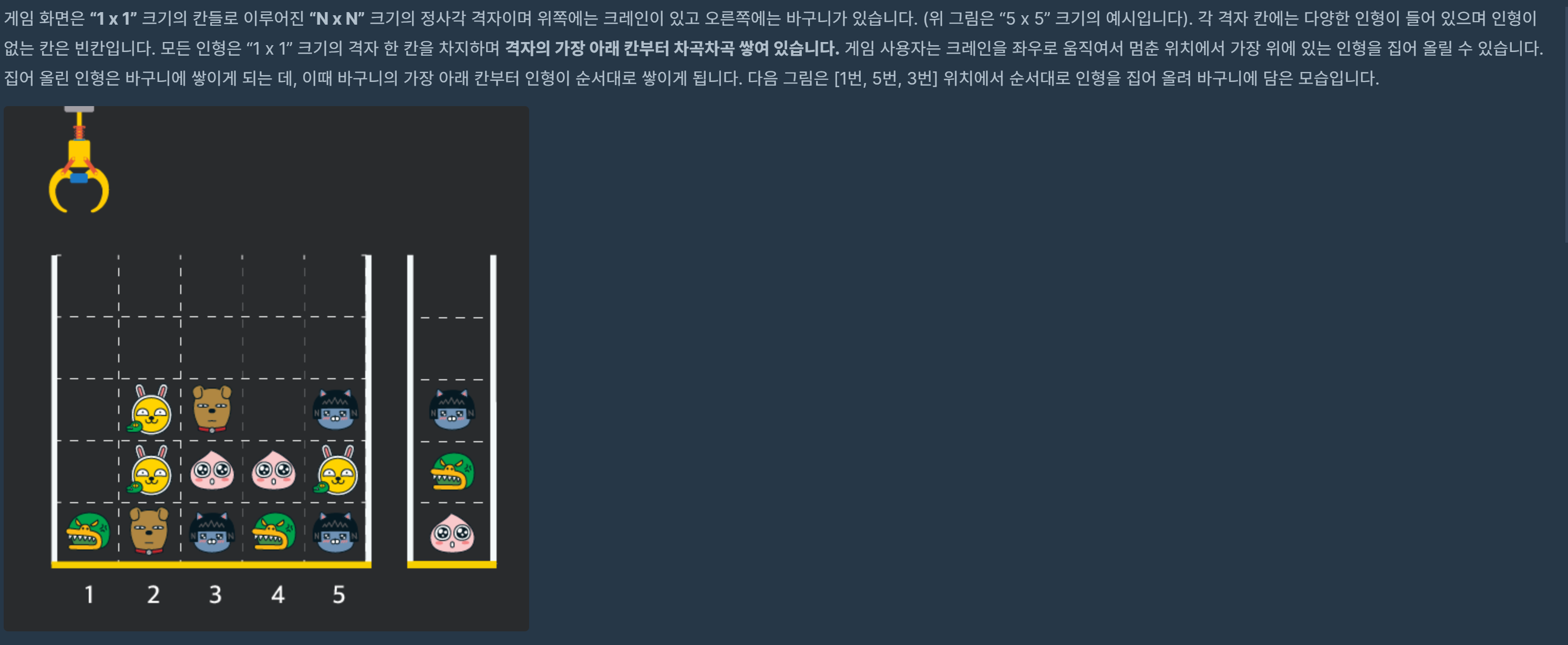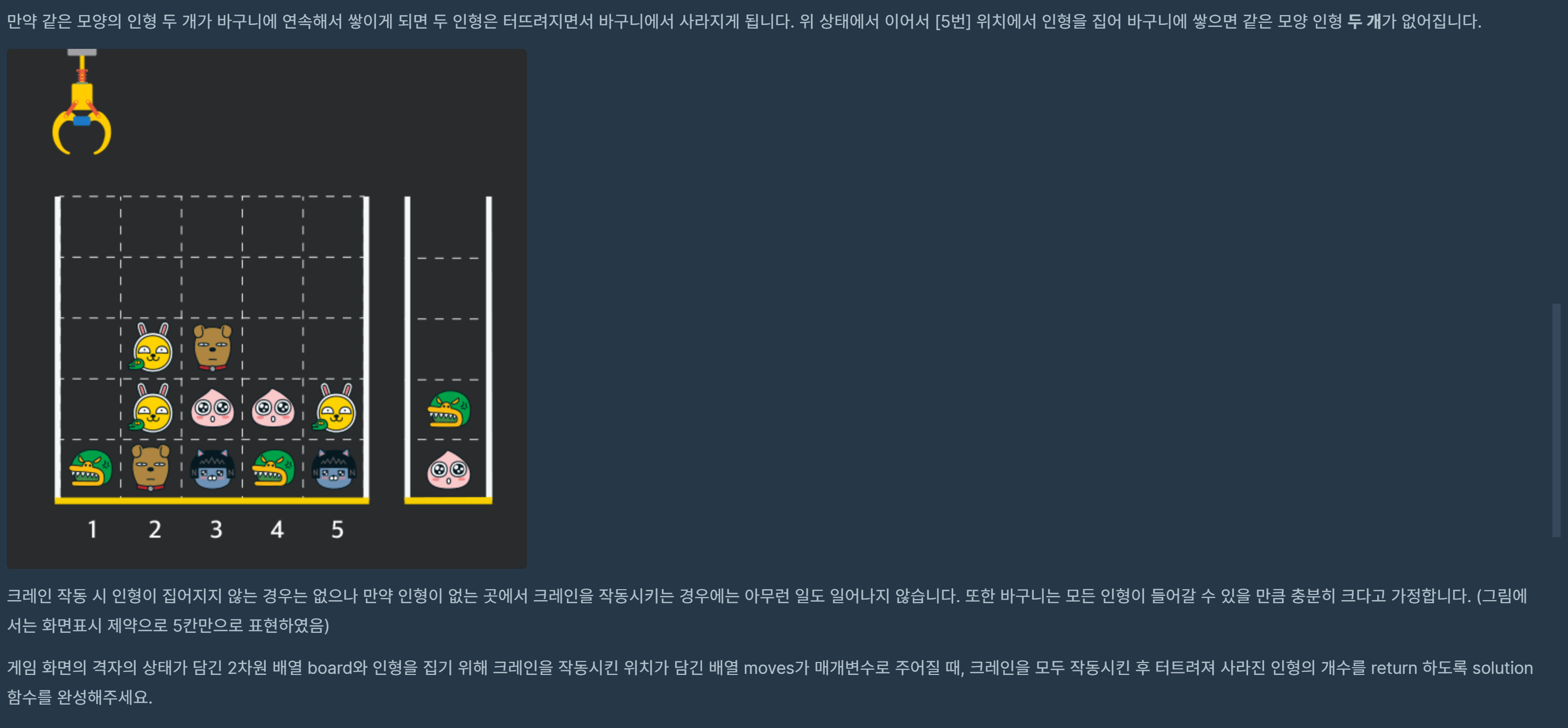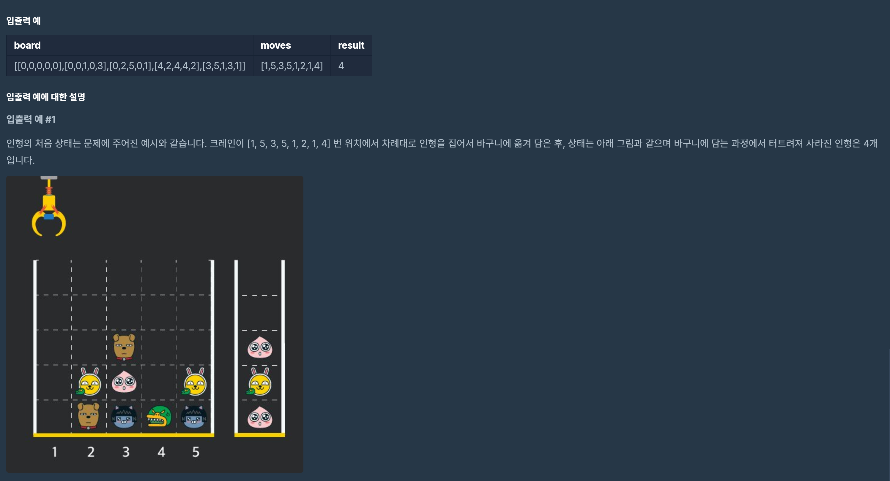 - moves 배열 각 원소들의 값은 1 이상이며 board 배열의 가로 크기 이하인 자연수입니다.